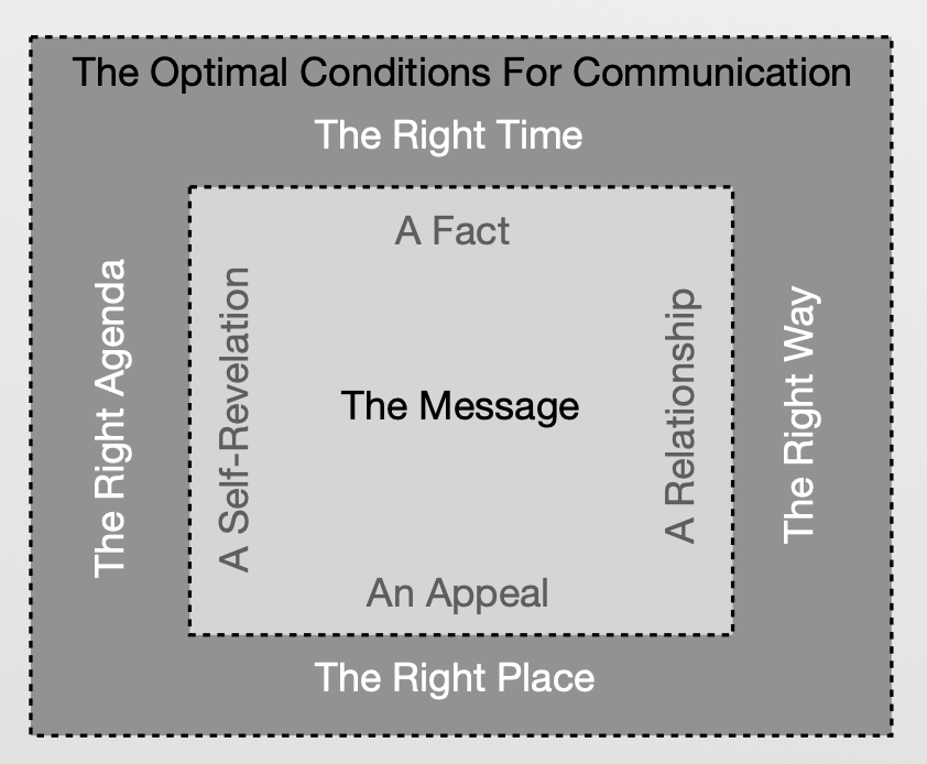 Moving to the inner square, crafting the message involves four essential elements: the fact, self-revelation, relationship, and appeal. Communicate the data and information you wish to share—the fact. Reveal something about your motives, values, emotions, or personality to create authenticity and empathy—the self-revelation. Express how you perceive the relationship, establishing trust and understanding—the relationship. Formulate the request, desire, or instruction you seek from the receiver, fostering collaboration and shared accountability—the appeal.